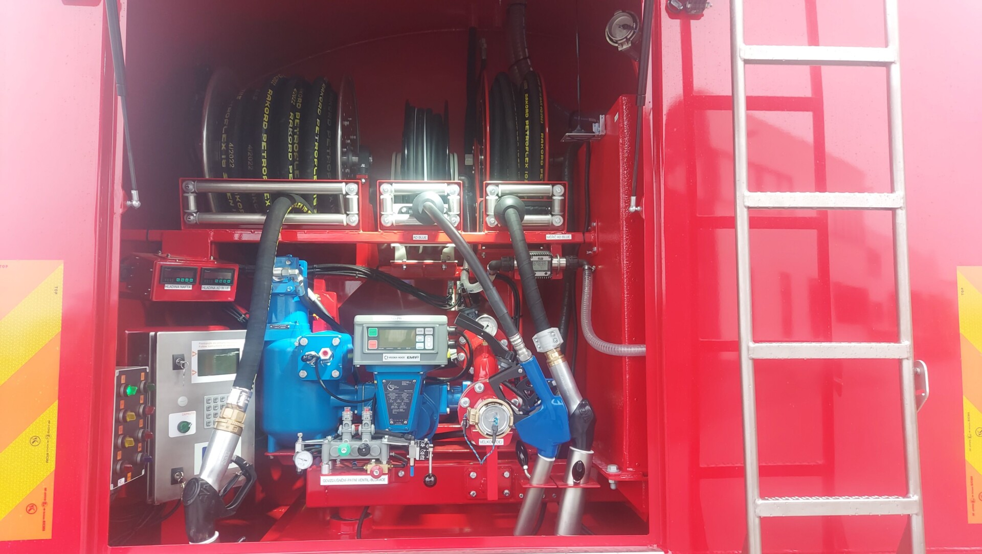 1x měřený výdej přes mechanicky pomocí torzní pružiny, hydraulicky nebo pneumaticky navíjený buben s hadicí DN 32 (38), délky 15-40 m, výdejní pistole DN 32 (38) – průtok 180 – 250 L/min.,